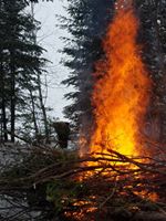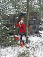 December 26, 2017. Step #1 in land development: clear a space to work. So we clear and burn, clear and burn, with an enthusiasm that surprises me. Is it the day after Christmas? I hardly notice. While others are returning gifts or recovering from big meals, we are chain-sawing and chopping and hauling and heaving and burning. I’m not comfortable yet with a chainsaw or an ax, so I do the hauling and heaving. The fire reaches up almost 40 feet, singeing the waterfront trees that we hope to keep. We also singe our hair if we get too close. I’m not used to big fires. It’s a bit unnerving, and I’m grateful for the surrounding snow.