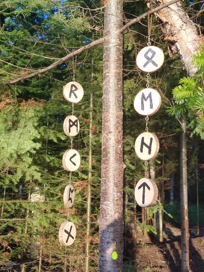 June 22, 2018. I think of the Vikings as distant relatives, although there’s scant evidence that any came from Finland. They were nature-lovers, as I am. They needed the sea, as I do. They had wisdom, as I hope to; I discovered that when I uncovered an old volume of The Book of Runes years ago. (They also were fierce warriors and invaders, but I’ll leave that aside for the sake of my romantic fascination.) Seeking a way to make my personal mark on my new camp, I decided on a wind chime made of slices of balsam from my property. I decorated each slice with a rune of significance to me and resolved to use them for inspiration and guidance.