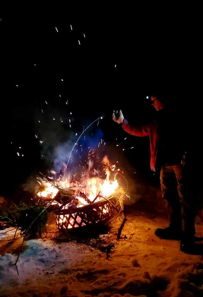 Jan. 13, 2019.  Who does an outdoor campfire on a snowbound winter night? Hardy northerners do. Because sounds are fewer, they’re magnified. The ice is cracking loudly a few feet away while the fire pit crackles away at my feet. And although I can’t hear it, I know the home-made wood stove is also crackling in the tiny 12-foot camper about 30 feet away.