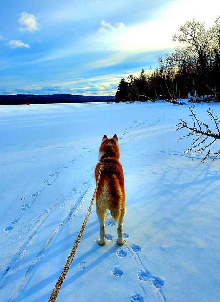 Jan. 25, 2019. I tested Roscoe’s Siberian Husky genes today through the use of a harness and 12-foot rope, for a cross-country ski on Huron Bay. A few inches of snow covered the ice, which is perfect for skiing…but without a trail to follow, it was not perfect for mushing! He wasn’t sure which way to go and didn’t understand my directions. I’m not sure I was giving them correctly anyway. When I found a snowmobile trail to follow across the ice, we went more smoothly. Mush, Roscoe, mush! After a mile or so, he seemed to lose interest. It may be in his genes, but he still needs training. And so do I. We’ll try again another day.