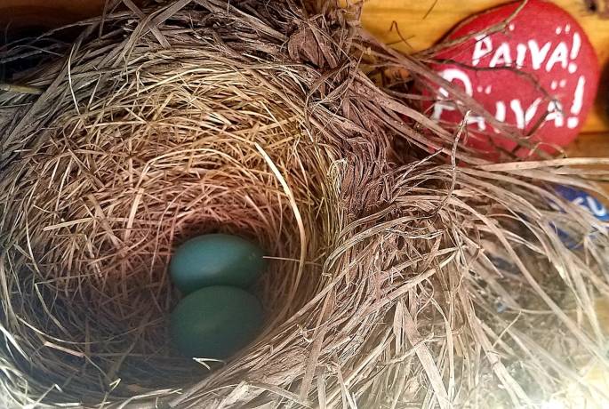 May 29, 2019. A robin made a nest in our outdoor electrical box, and now we are new parents! Jeff made a sturdy wooden box right after we had electricity installed, to protect a group of outlets that feed our camper and utility trailer and outdoor kitchen. He added shelves to hold bug spray, lighter fluid, etc. Now look, a delightful new use.