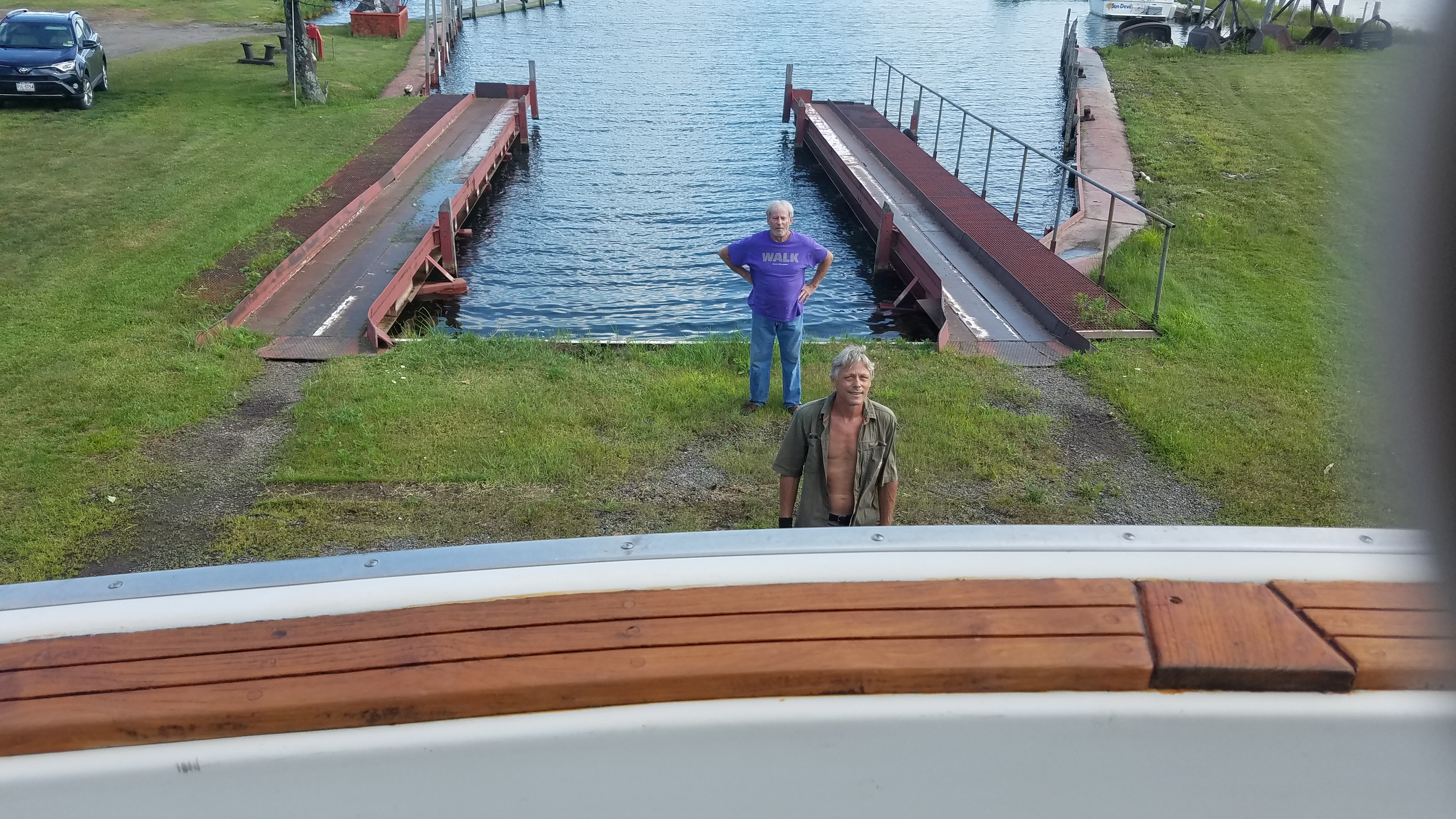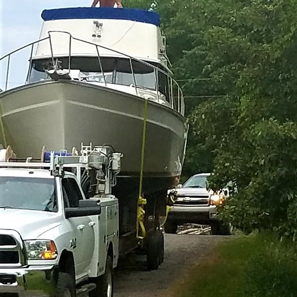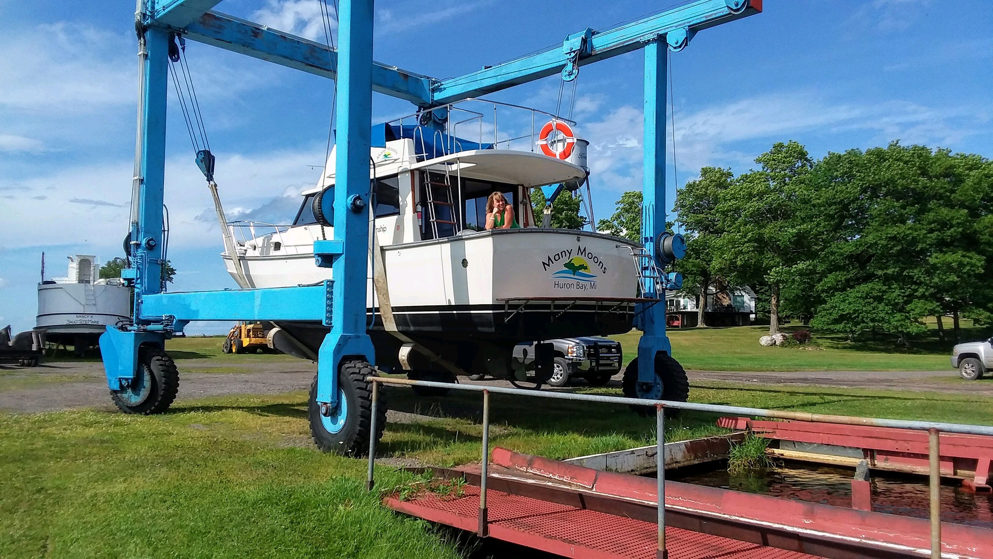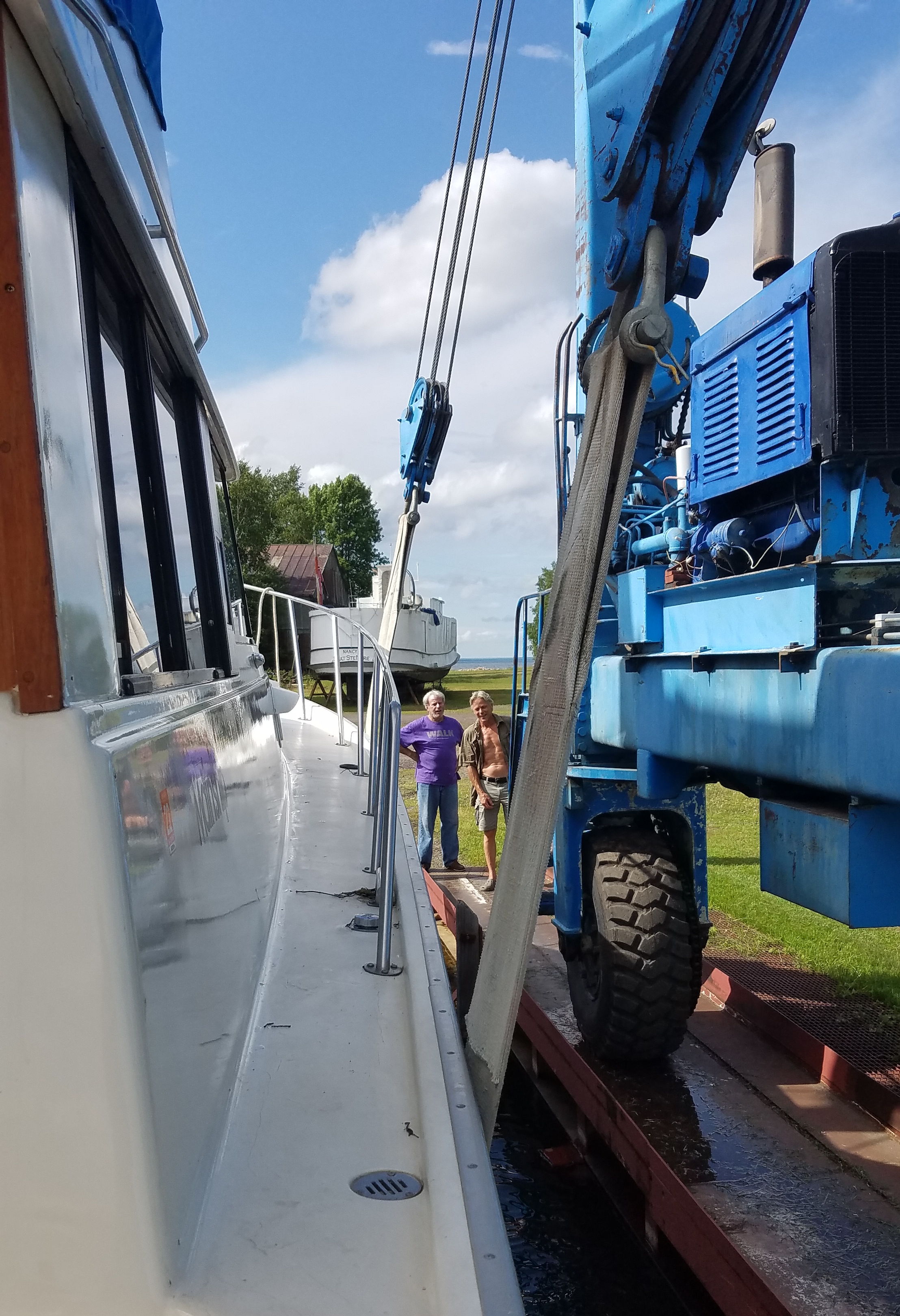 July 17, 2019. The Mainship Many Moons is ready for launch! Jeff bought this used 34-foot trawler last fall and spent months documenting it, renaming it, and refurbishing it in his yard. Today, it goes into the water. Exciting! This milestone launches Jeff’s dream also. He hopes to do The Great Loop in this boat. But first, it needs to be towed from his home to the historic Pequaming Marina. It’s only three miles, but this boat is big! (Jeff’s last boat was 20 feet so this is a huge step up.)