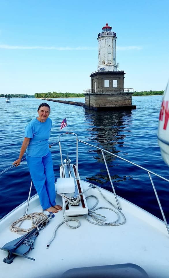 August 2, 2019. Jeff is the captain of the Mainship Many Moons. For her maiden voyage, he chose a night-crossing of Lake Superior, to the remote national park called Isle Royal. I’m uneasy about this but trust his judgment and his knowledge of the boat. I know the sea is calmer at night, and lots of people do it. I’m eager to visit Isle Royal (one of my favorite places) again. But I also know that Lake Superior can act like an ocean and can be even more unpredictable. As we pull into the town dock at Houghton a few hours into our trip, I’m thinking about the 50 or so miles of open sea ahead of us. The trip will be about 100 miles each way from our home base, which will test both the boat and its crew. I’m glad to have my oldest sister along, since she is an M.D., and, well, you never know! Jeff’s son is along too, and the four of us will take turns at the helm overnight. I try to silence my inner doubts. I’m a Navy captain, for pete’s sake! And a boater! But I expect a challenge, navigating a single-screw boat that is new to me, on open seas on a moonless night, with a quirky compass and unfamiliar navigation equipment. I wish we had done more short cruises. But I remember my professional promise to myself: when I disagree with “the boss,” object twice (to make sure you’re heard), state my reasoning, and then shut up. I did that. So I do shut up, and enjoy the ever-changing sky and the sound of water passing under the hull.