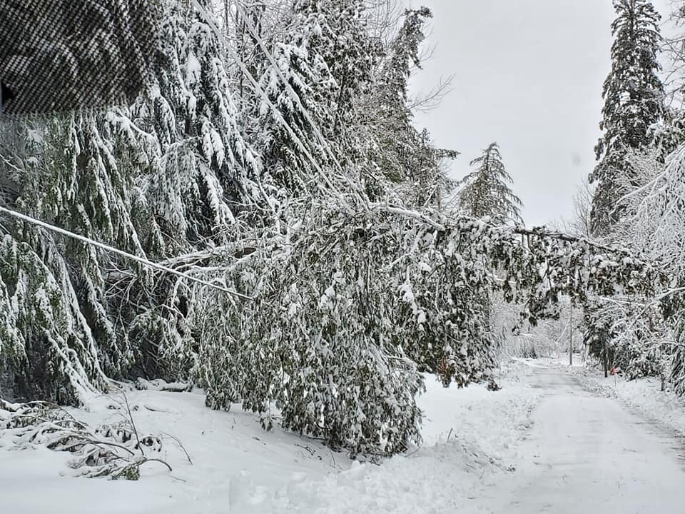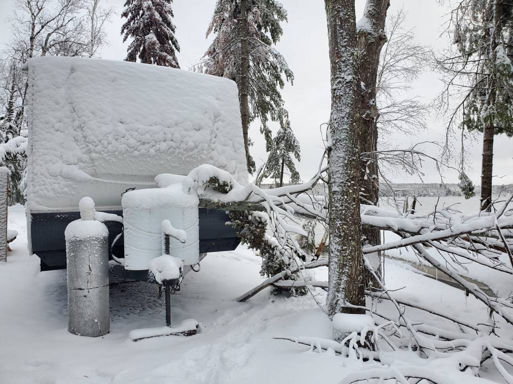 Nov 30, 2019. Some storms announce themselves loudly and some sneak up on you–kind of like elections (fanfare) and mass protests (sneak-up). Both are caused by atmospheric instability and both change the landscape. The Thanksgiving 2019 storm was a bit of both — expected, but more fierce than was forecast. It was the storm of 18s: it left 18 inches of snow on the ground, took our power for 18 hours, and took down at least 18 trees at Camp Many Moons. It also be-headed many more trees, meaning only the top three or four feet fell off. Fortunately, the tree-top that fell on top of the camper left no obvious damage, and the tree that fell in front of it landed — improbably! — in the narrow gap between camper and hitch.