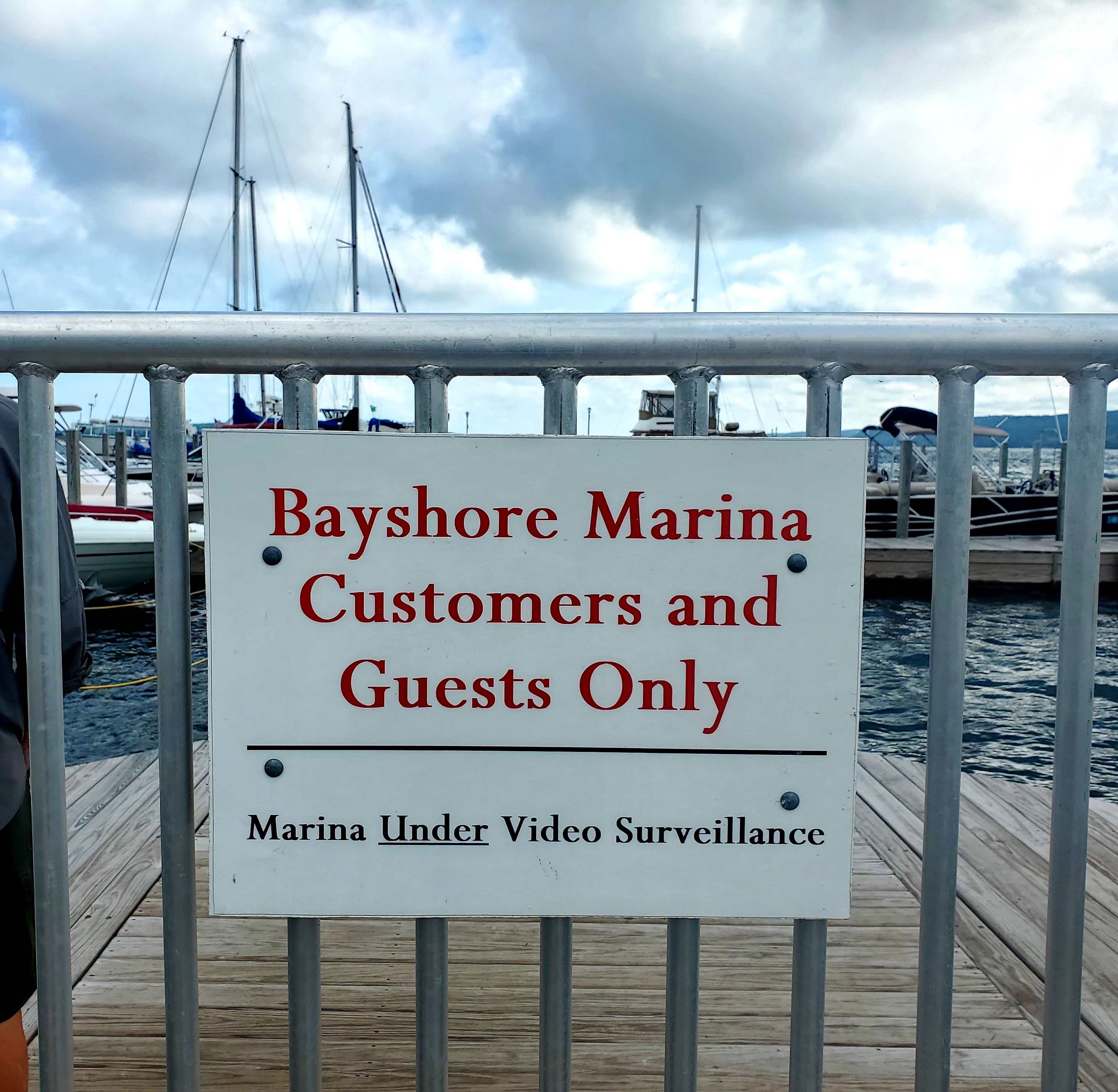 After weaving through islands and channels for a few hours, we arrive at the marina in a brisk north wind that blows us around. We have headsets on board to use during anchor or docking operations, but forgot to recharge them, so Jeff can’t hear me warn him. (He’s inside the cabin, on the helm. I’m outside, waiting to toss lines.) It’s our first arrival in a busy marina in this boat and a little stressful! We bump where we don’t mean to bump. An expletive or two is murmured. With an assist from the dock manager, we’re tied up in short order. Later, we do a “debrief,” which my Navy training insists upon. 😉 Remember to check the flag for wind direction, charge the headsets, etc. We know these things, but it’s hard to remember everything when you’re just getting started. It will become habitual in time. We feel better about our small mishap when a much fancier boat gets blown around and does damage to the dock and to another boat. Everyone comes to watch. The boat’s skipper is grim when he jumps off to make amends, murmuring something about a malfunctioning joystick. I hear mumbled judgments by onlookers. I remind myself it could happen to anyone. To us.