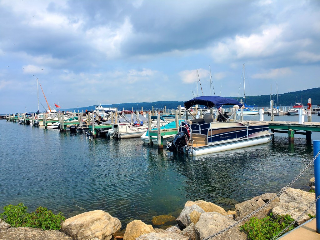 Today’s cruise is about 40 miles – shorter than Day 1 – but still takes us 7 hrs. A trawler moves 7-8 mph and the wind and water conditions can slow us even more. Port #2 is Munising in the heart of Hiawatha National Forest. (Such a musical name! It’s a joy to reacquaint myself with my birth area, this time by water.) This is the gateway to Pictured Rocks, the nation’s first national lakeshore and very busy in summer. I call the marina to ensure they have slips for a sailboat and trawler. They do. We relay this to Impulse by radio. The cost for a slip is $1.75/ft. For our boat, that means $60/night. I swallow my frugal instincts. We’ll anchor out another day. Tonight, we need some comforts!