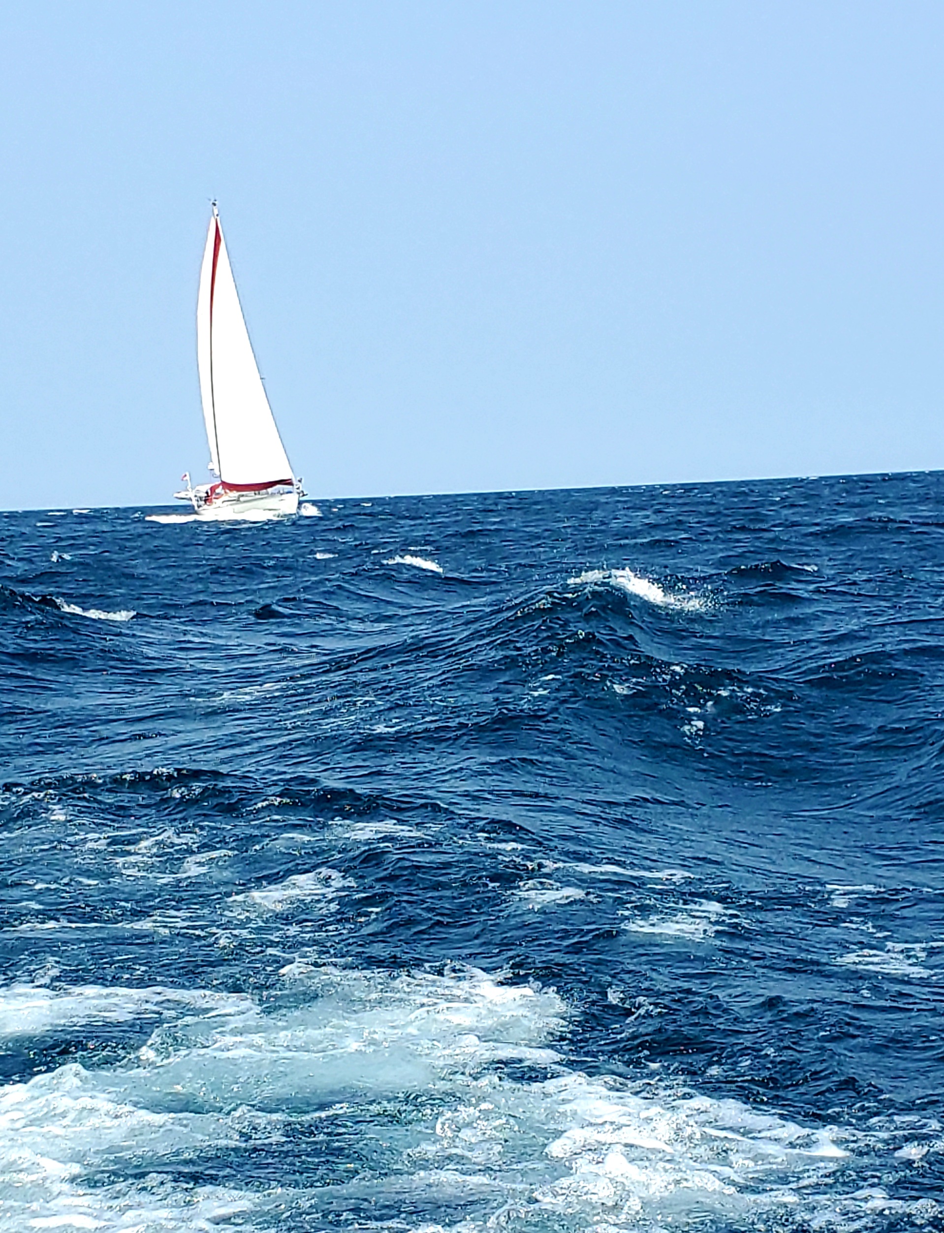 Second day under way and it already feels like a week! We ask each other what day it is. (Our “calendar” is now the weather forecast.) We try to establish an on-board exercise regimen – planks and exercise bands for me, push-ups for Jeff – to keep our upper-body strength. I learn to keep food and drink coming while underway, though it’s simple fare. I take my turns at the helm too, though the following seas – with whitecaps — require steering through every swell and I’m not yet comfortable with it. I over-steer and the boat yaws first one way and then the other. It’s a single-screw boat and pretty tricky to steer at times. I’m glad to have experience with a water ski boat (which is also single-screw), though it doesn’t seem to be helping me much right now. I’m also glad I’ve done a lot of boating already. I can’t imagine brand-new boaters doing this, although some do.