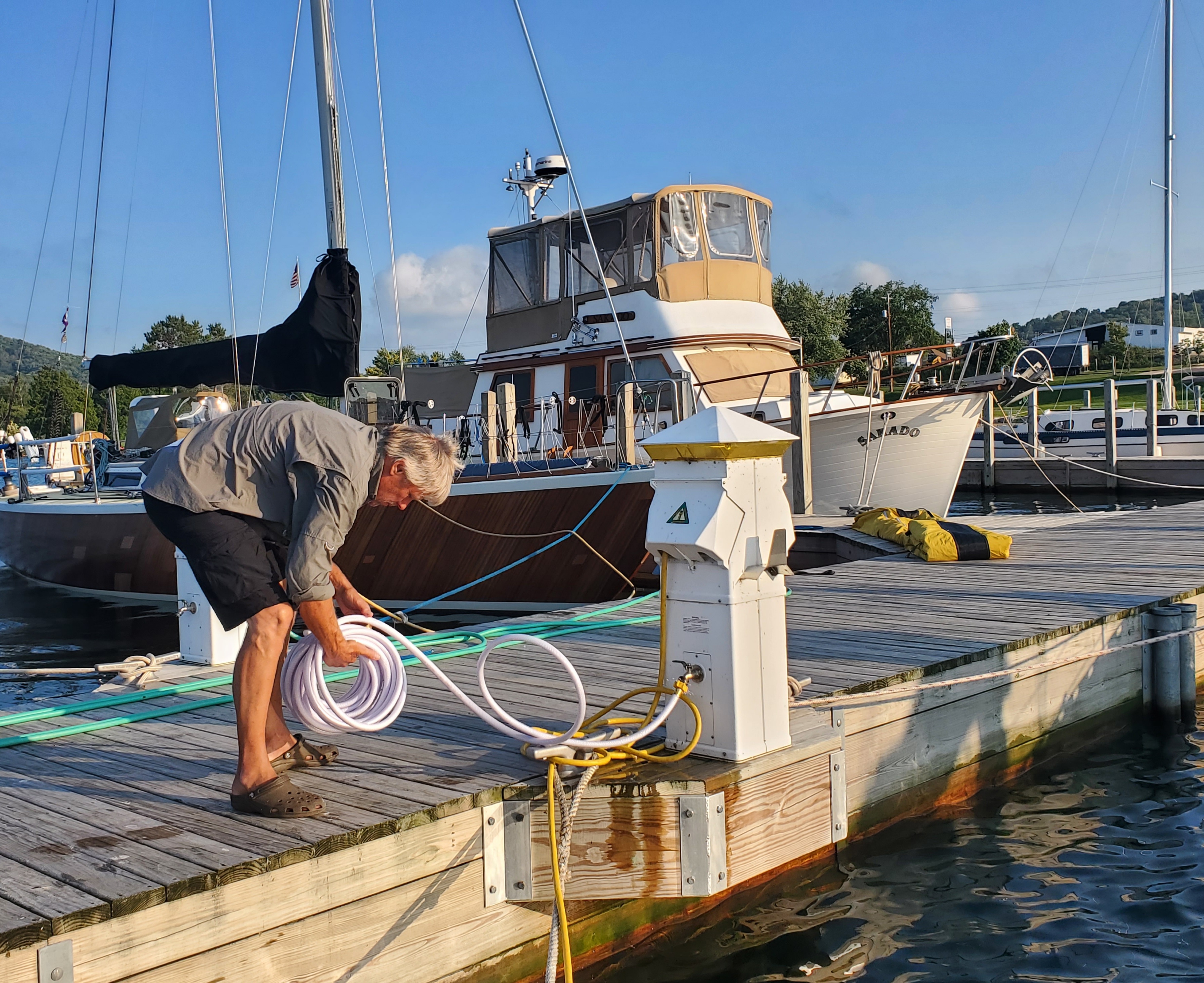 Today was a welcome day in port (Munising), at least for me. As a stubborn north wind continued to blow, the sightseeing boats that take up much of the dock space here – and bring in lots of tourist money – remained in port, reminding us that even capitalism bows to weather. We did boat maintenance and galley organization, fought with a stubborn marina Wi-Fi, and cooked real food. It was a hoot to host Sunday brunch for our sailing buddies in our sunny salon. (Such a grand word for the largest compartment of our humble trawler, but that is what it’s called!)