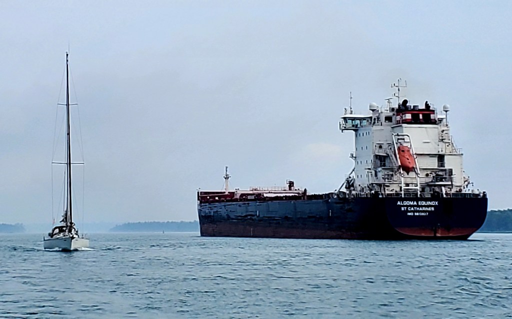 After a week in wide-open Lake Superior, these confines feel disconcerting at first — especially when we encounter our first freighter, seemingly heading straight for us! It’s not, of course. There’s more room to navigate than appears at a distance, but we hug the right side of the channel all day just to be sure. Later, a 2nd carrier astern — which we’ve been eyeing for hours — finally overtakes us. This thankfully occurs in a widened area of the river. I never feel at potential risk this time and delight in taking pictures of our companion boat alongside the monster ship.