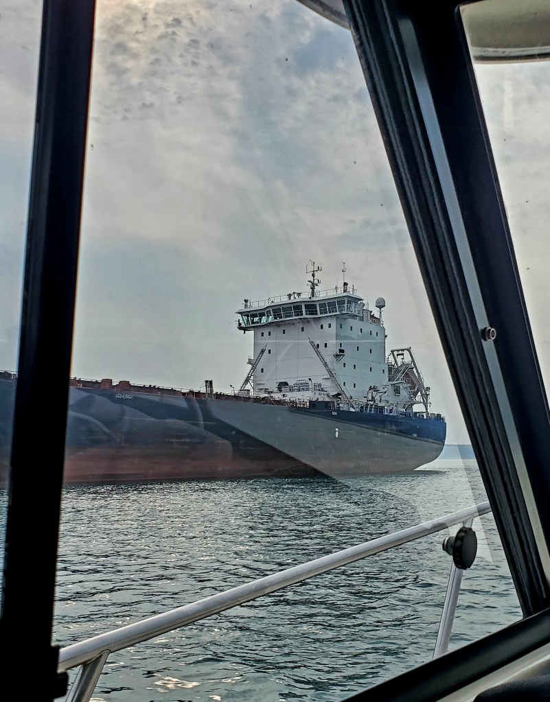 When we enter the narrowing shipping channel, we keep a close eye on the chart, buoys, channel markers, and other vessels. The channel makes regular turns — sometimes narrow ones — and keeps us on our toes. The binoculars get a lot of use today as we identify the next buoys in the mist and confirm them on our charts – both electronic and paper ones. (I’m a fan of paper back-ups.)