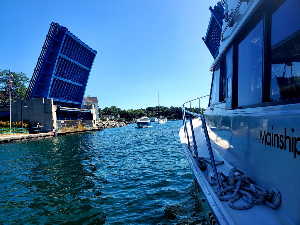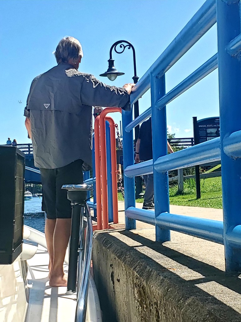 Today’s memorable event was navigating the short but exciting Pine River Channel. It connects Lake Michigan to Round Lake and Lake Charlevoix and is intersected by a lift bridge. On this sunny Saturday, the channel is full of boats. They line up on either side of the bridge waiting for the green light. We line up with them. Because we’re early and the channel is narrow, we hug the concrete wall while waiting. Tourists watch. It’s like the Soo Locks and St. Mary’s River in one. (See posts for Day #10 and #11.) But this time, fishing lines are dropped right next to us. We don’t snag any.