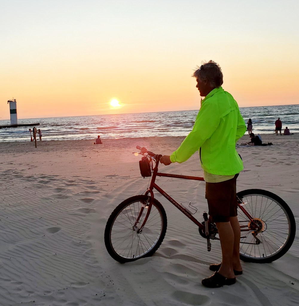 Thus relieved and relaxed, we enjoyed the day to watch fishermen return with their catch, take a long-ish bike ride, shop a bit, buy iced coffee drinks, and watch Sunfish races in the harbor. As the wind grew steadily all day, I grew determined to check out the surf. So we took our bikes to the beach, and … wow. Beautiful! The pier was closed and the red flag was out. People were still swimming, within the buoy markers, and I took a dip too. The water was deliciously warm! I was about to leave when Jeff pointed out three teens being pulled dangerously close to the break-wall. (There was a local warning out today, about swimming on that very side of that very wall.) A woman on shore was yelling to them but they couldn’t hear. I entered the surf again, as hastily as legs-in-water can move, to shout and wave my arms in the direction they should move. Such relief when they heard us over the sound of the surf and moved to a safer area! (I was pretty sure I wasn’t up to a life-saving move. I was a lifeguard in my teens, but I’m in my 60s now!) Turns out the other woman was the teens’ mother. She thanked me. I’m sure she had “a talk” with them later.