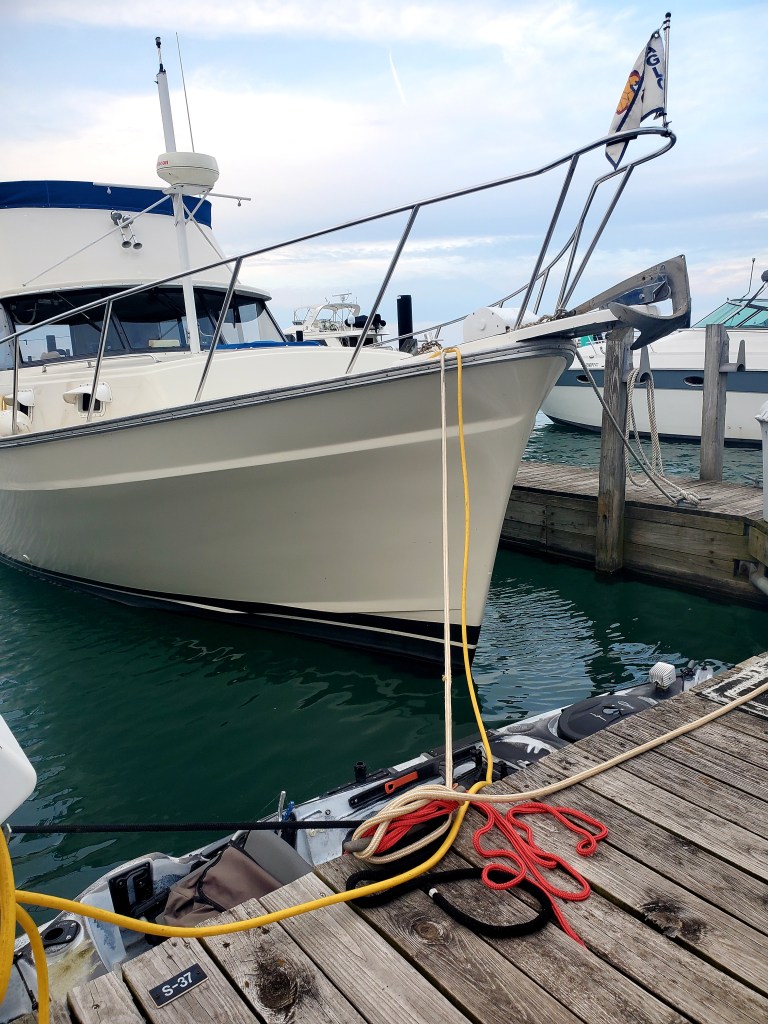 Our arrival here was almost as unsettling as the last hour of crossing. We stopped at the fuel dock just inside the harbor entrance to register and get our slip assignment, as requested. (Since the main office is so far away, they offer this alternate check-in.) We saw four boats already at the fuel dock, so Jeff “milled about” for awhile until a few left and made room for us. We got our slip assignment and a map showing us where to go. (Remember….900 slips!) There are no dock-hands here to grab lines. A stiff east wind was blowing. A kayak belonging to the neighboring boat floated at the end of our slip. A very large black post marked one side of our slip, seemingly blocking the entrance, which looked very narrow. Jeff proved his increasing skills in boat handling as he turned the boat around in the fairway — the waterway between docks — for a better approach. We bumped the black post, which turned out to be soft and probably meant for that purpose, and then bumped the dock. Those consecutive bumps put us exactly where we needed to be, but we were coming in fast, blown in by the wind now at our stern. For once, I managed to put the amidship line exactly where I wanted it — around the middle post of the dock. (I’m still rather clumsy at line handling. My fellow Navy officers would be dismayed. 😉 ) We both had to jump off onto the dock in order to secure the boat.