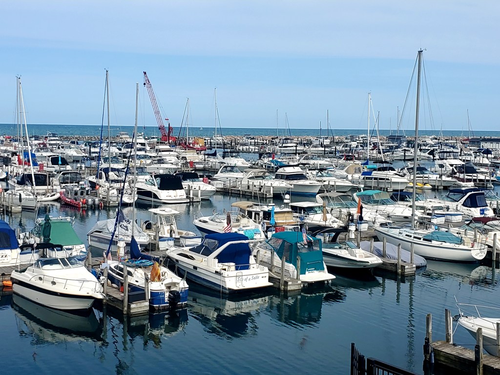 We’re grateful to be here, just the same. We had a narrow weather window today for the nearly 40-mile crossing from New Buffalo. After dockside consultations with our fellow Loopers, we decided to try it, giving ourselves the option to turn around. We left late enough for the swells from the recent north winds to calm some, and early enough to avoid the predicted northeasters. It worked for about three hours; the swells were 4-5 feet, but widely spaced so manageable. It felt pretty lonely out there, as we saw no other boats. (We could see several moving elsewhere on Lake Michigan, through our boat-tracking app, but none near enough for us to see.) We noted our passage from Michigan into Indiana, and from the eastern to central time zone. The first good glimpse of the Chicago skyline came less than two hours into the four-hour trip.