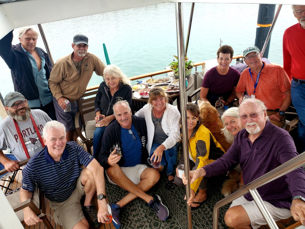 Last night, our 3rd night in the Hammond Marina (about 12 miles south of Chicago, in Indiana) was quite fun. We were invited to “docktails” — i.e., social hour — on board the big yacht Quite Nice, also doing The Loop. We met many more Loopers, almost all with boats bigger than ours — sometimes a lot bigger! But we felt very much welcomed and at home. I’m not a natural socializer (in spite of many years doing just that as part of my Navy work), but it was genuinely fun. After dark, we enjoyed live outdoor music at the marina, our 4th such experience on this trip.