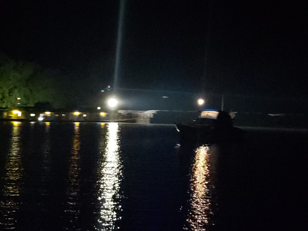 Mike from Wind Shift took this photo at 0430 as a barge passed by Many Moons, anchored closest to the channel. The bright light is the barge’s search light. Many Moons is on the right, our interior night lights visible through the white cover over the windshield.