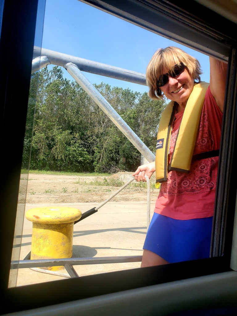 Holding our boat to the bolllard before descending in La Grange Lock, our 8th and last on the Illinois. My “boat haircut” needs work after six weeks under way! (Cosmetic concerns are reduced on a boat. 😉 )