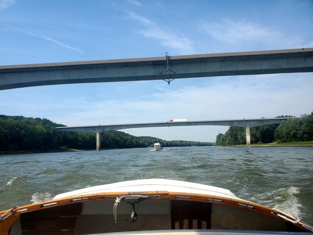Passing under yet another RR bridge. So many on this river! Products moving across America…This modern double-highway across the Illinois represented the westernmost point of our trip.
