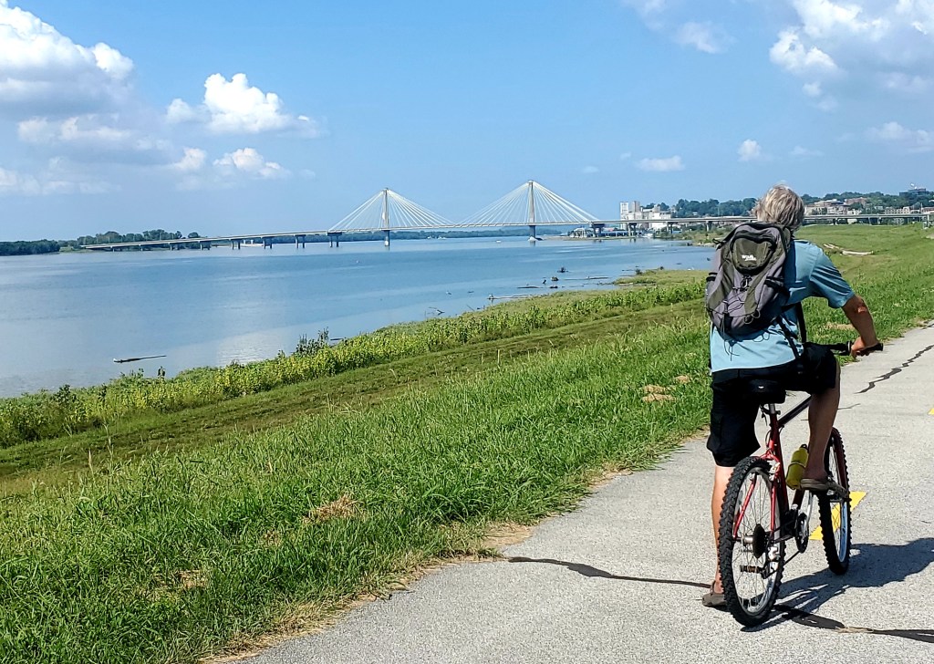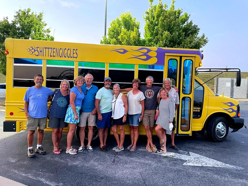Some people do The Great Loop as a kind of race — a souped-up pontoon boat just finished it in about 60 days — but most of us like to take time to absorb and learn. Today’s education came from the National Great Rivers Museum. We went by bike on this beastly-hot day and were grateful it was just a few miles away! Still, we envied the e-bikes of our Looper companions. (They went on to other museums while we retreated back to the A/C of our boat.) After projects on the boat and more than one dip in the pool, we joined four other Looper couples for a hilarious outing to the local cheap-food place called Fast Eddies. It was hilarious mostly because of the transportation — a Lyft ride by someone from across the river who was out of her element on this side of the bridge, and an even more improbable ride back on a bus built for partying. Jello shots. Blow-up animals. And other left-behinds of a bachelorette party. It was only a 10-minute ride, but a memorable one!