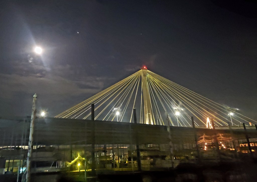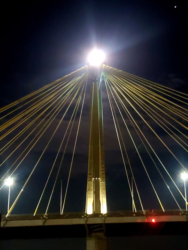 1. When a full moon meets the apex of a cable bridge, it looks like a spotlight.