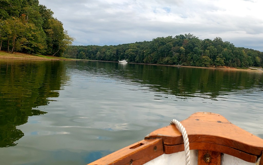 Our floating home arrived at Sugar Bay on the east side of Kentucky Lake just as the skies began to open. (They were restless all day, punctuated by both white puffy clouds and ominous deep gray ones, so we knew we were racing the weather again.) “What is it with us and sugar?,” I asked, remembering our hairy arrival at Sugar Island on the Illinois River as a storm blew in. This was a passing rain, though, and we were soon exploring by dinghy. We also received a visit, by dinghy, of the Loopers who are anchored in a different inlet about a mile away. Photos and captions below.