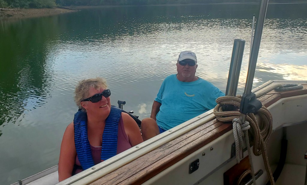 Peter and Cheryl, who we have never met, stopped by in their dinghy. Their boat is anchored out of sight about a mile away. I sent them a note via the Looper’s messaging app, and they responded in person!