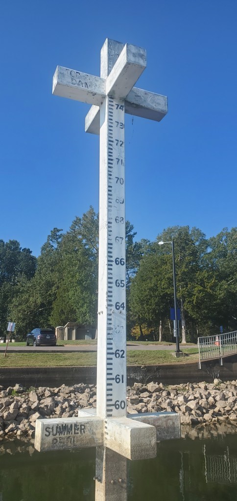 Water level gauge at Paris Landing State Park, three days ago, showing the height of the Kentucky Dam (at top) and the normal summer and winter water levels (at bottom). The winter level is far below this photo.