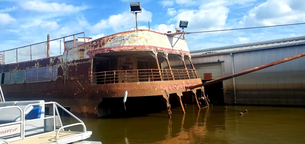 This rusted shell was launched in 1929 and apparently hosted Congressmen on river trips. It had no power source and was pushed by a barge. The upper deck held staterooms and the lower (now under water) held a ballroom with chandelier. That’s the story told to me by the marina manager.
