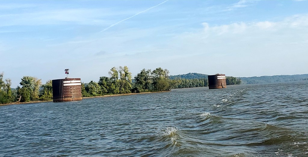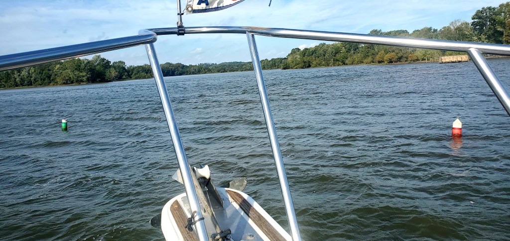 Even though we’re heading generally south, toward the Gulf of Mexico, we’re still going upstream, against the current. And we feel it, especially where the river narrows. It takes 1-3 mph away from our forward momentum. And the course is zig-zaggy at times! We are still on Kentucky Lake (which is almost 200 miles long) and also on the Tennessee River (which runs through it). The water is wide but the navigation channel often is not. Following the buoys, we cross from one side to the other. Our route in and out of last night’s marina was especially exciting, involving at least 12 turns within two miles.