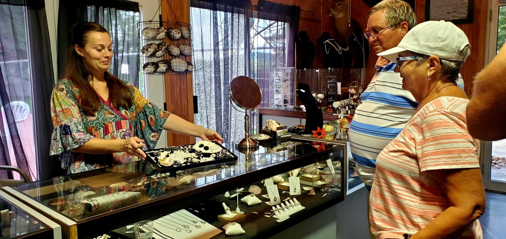 The Birdsong Pearl Museum and adjacent pearl farm was an eye-opening delight. (Who knew that pearls can be made by any mollusk, not just oysters, and the farmed ones are “seeded” into the mollusk’s gonads?) But I could have done without the Bible verses that were liberally offered by the charming manager and mostly centered on sin, and her ending “sermon,” sweetly-delivered though it was and cleverly tied to a pearl analogy. The small marina store sold ball caps embroidered with Bible references. It’s a private marina, so it’s their right. I suppose they aren’t concerned about losing business from progressive Christians or agnostics or Jews or Muslims.