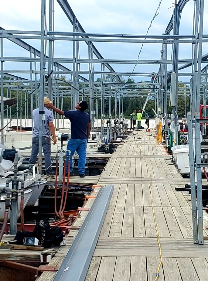 A Spanish-speaking crew from Mexico is rebuilding the damaged piers at Birdsong Marina.