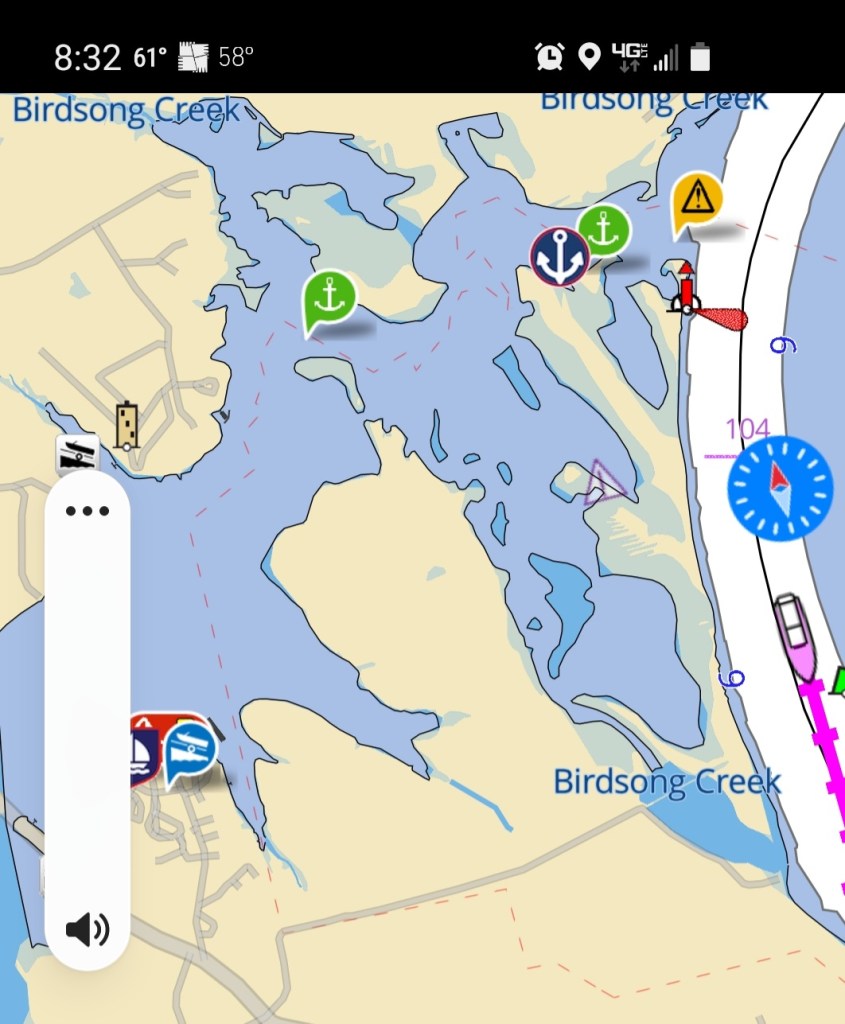 The red dashes show our 2-mile track through Birdsong Creek, dodging shallows and shoals. So grateful for the channel markers! (We still had to keep our eyes wide open, and I used binoculars to help Jeff navigate.)