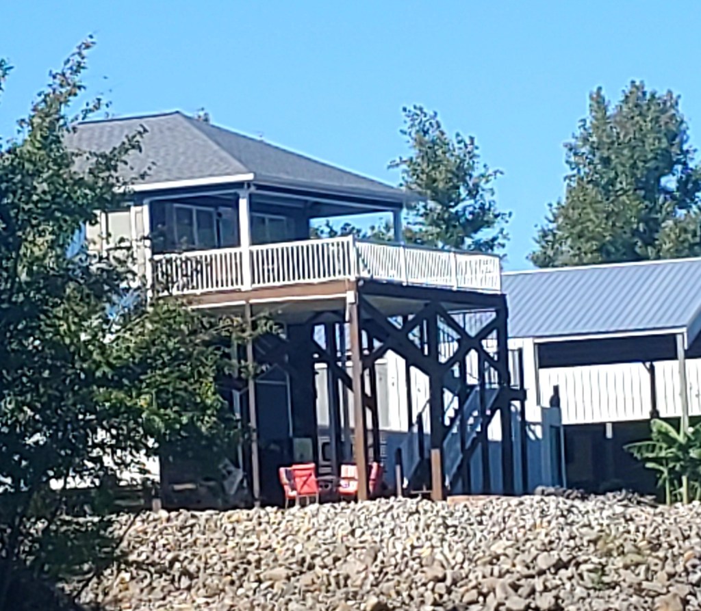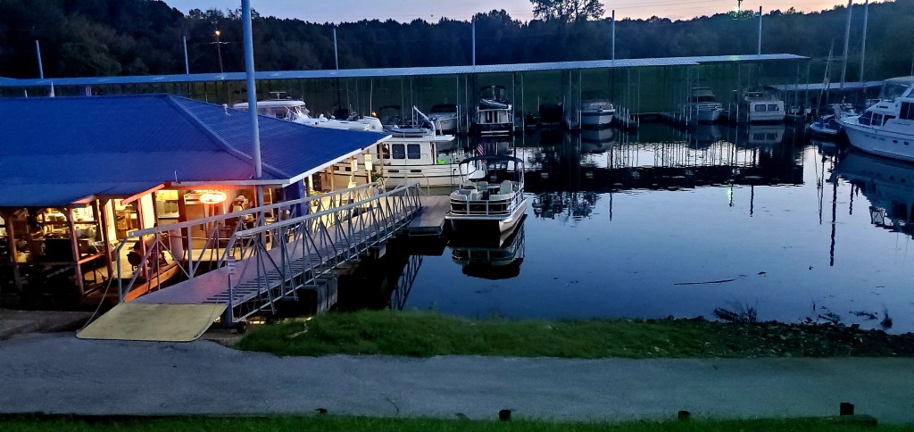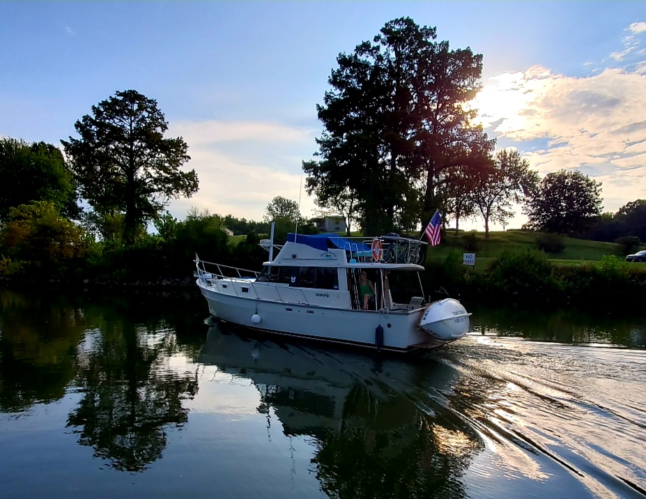 As I write this, we are anchored in a pitch-dark and narrow creek just off the Tennessee River, about 10 miles from Pickwick Dam. Our fellow Loopers on 50-foot Varlabania are anchored just ahead of us. We are in this creek, which is not a designated anchorage, because our chosen and publicized anchorage a half-mile away had such a strong current that we knew we couldn’t sleep well there. Both boats set anchors there and pulled them back up again. We will go through a lock tomorrow morning and need to be fresh. Jeff saw this small creek nearby and offered to explore it. After Many Moons tested the depths and set anchor, the larger boat followed us in. (I’m at the helm during anchoring while Jeff lowers the heavy 2-anchor system, and it’s a fun challenge when we’re working well together.) I rowed the dingy up-creek to explore, but the isolation and darkening evening felt a bit weird. I turned around pretty quickly.