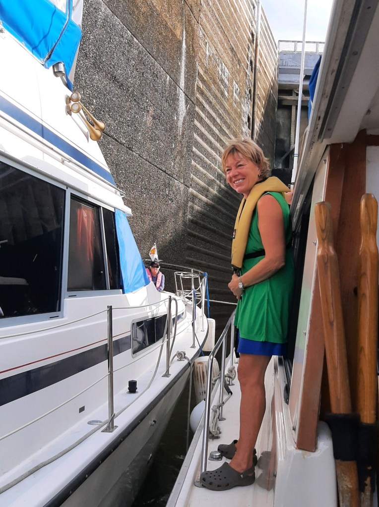 Many Moons and Ginger Gail at the front of the lock as the water pours in to raise us 53 feet. This is our 12th lock, and the 2nd to raise us up rather than drop us down.