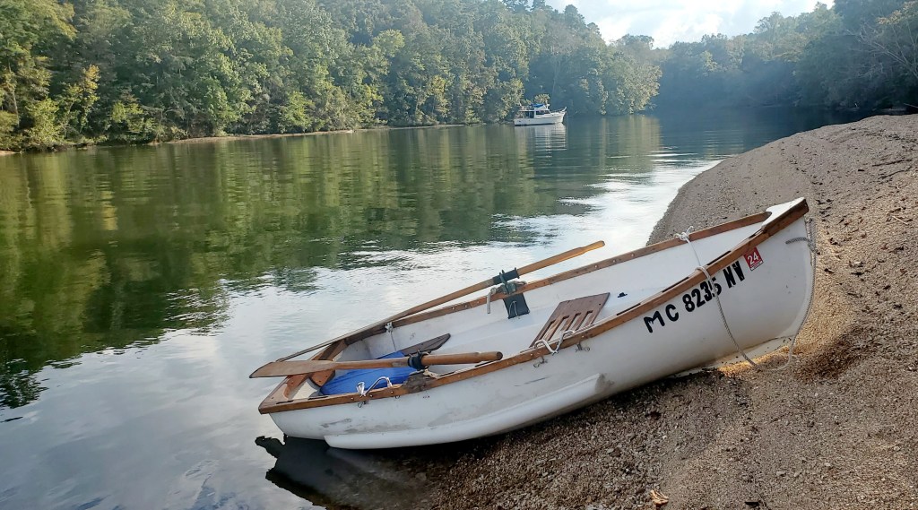 By the way, our anchorage in Snake Creek just before Pickwick Lock was beautiful — but somewhat risky, in hindsight. We tucked into a small creek (see previous post), and the water fell about two feet overnight. The water rises and falls with dam openings and closures, and I admit that I’d not checked the website that tracks such things. Fortunately, we had no trouble leaving the creek, having a shallow keel — but our larger boat-mate had a deeper keel and a trickier time of it. He reported just 1-2 feet of water under him as he navigated out of the creek and into the river.