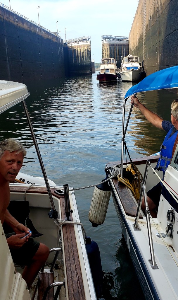 In Pickwick Lock, Many Moons (on left) rafted out to Ginger Gail. Betty Gail and Varlabania are behind us, with Matoaka and Weeble Wobble behind them. Ginger Gail was about to “cross her wake,” meaning complete the 6,000-mile loop. We had time to visit Nick and Ginger and hear some of their amazing stories.