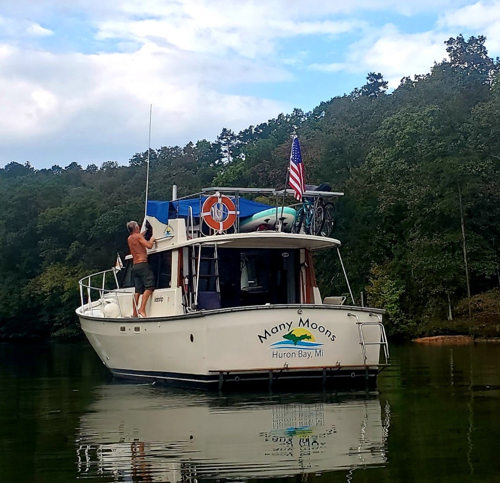 Jeff cleans the boat at anchor in Boo Hollow, just off Pickwick Lake. We considered anchoring near others but decided to spend a night alone. It’s important to balance social time with private time.
