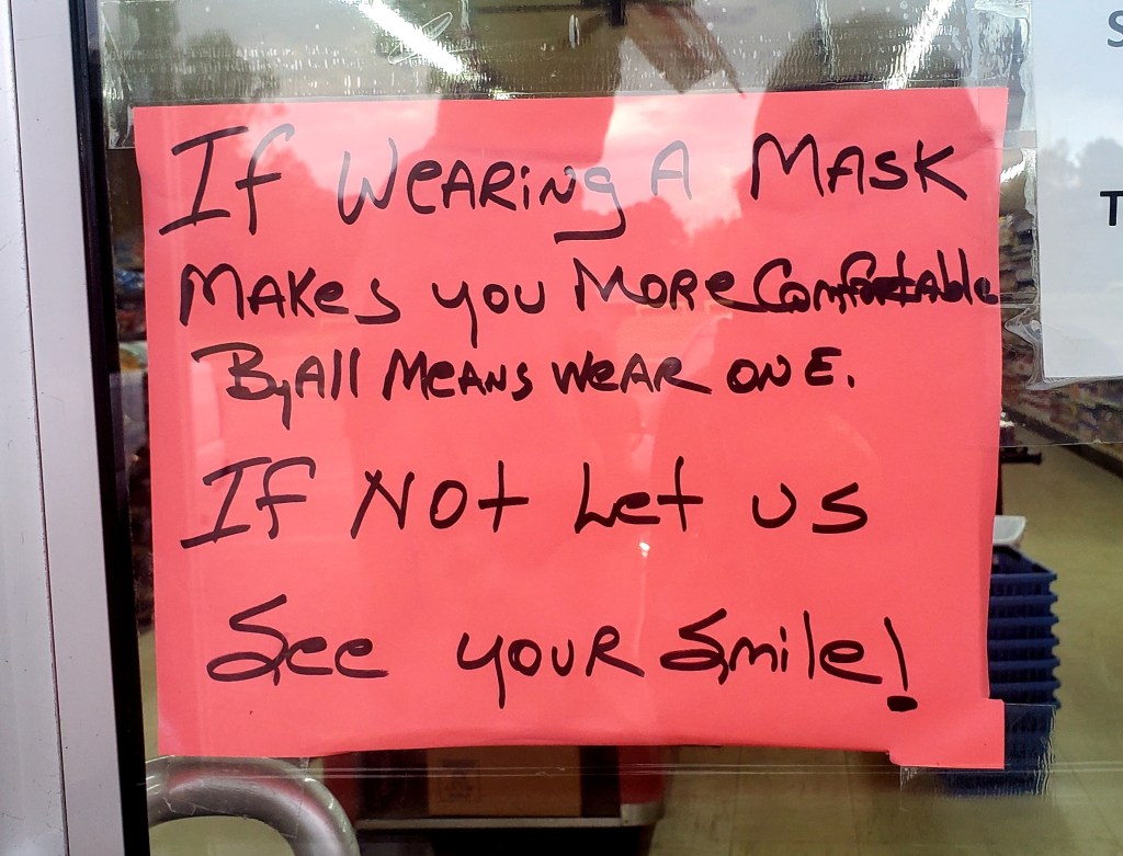 On a storefront in a small town. We rarely see masks here, and no reference to vaccination status. Quite different from other parts of the country. It’s interesting, that word “comfortable.” I take this sign as putting individual choice above community well-being, but maybe took it wrong. In the age of COVID, I think of masks and vaccinations as more about protecting others (reducing transmission) than about protecting me.