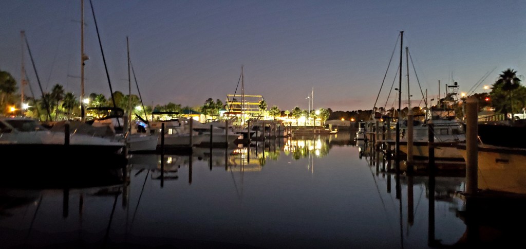 We’ve entered the Gulf Coast Intracoastal Waterway (GIWW). After crossing the wide-and-shallow Mobile Bay — about 30 miles across — we spent last night at Lulu’s Homeport Marina, owned by Jimmy Buffet’s sister, in Gulf Shores, Ala. It was our highest-priced slip after Chicago, though we expect higher in Florida. Lulu’s is one of those tourist attractions that seems “famous-for-being-famous”…lots of colorful signs, a large gift shop, and somewhat overpriced (but tasty) food. It’s probably great fun in the summer, if you like being “where-it’s-at.” We had a long walk to the restroom, and I had a long wait once there. I’m glad we went, but once is enough. 😉