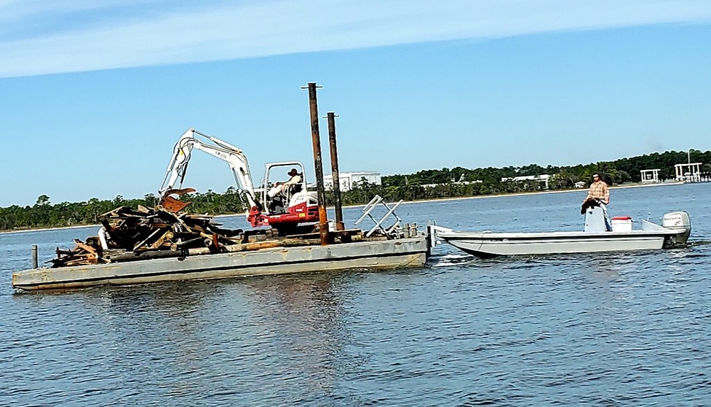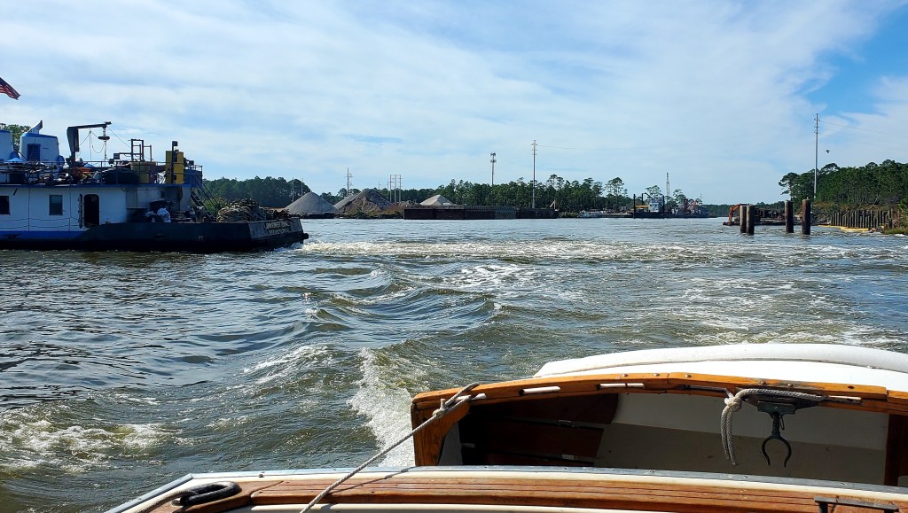 We encountered this tug barge on the GIWW, pushing a load against a bank. We saw two boats in front of us fly sideways in the prop wash, so we were prepared. See below….