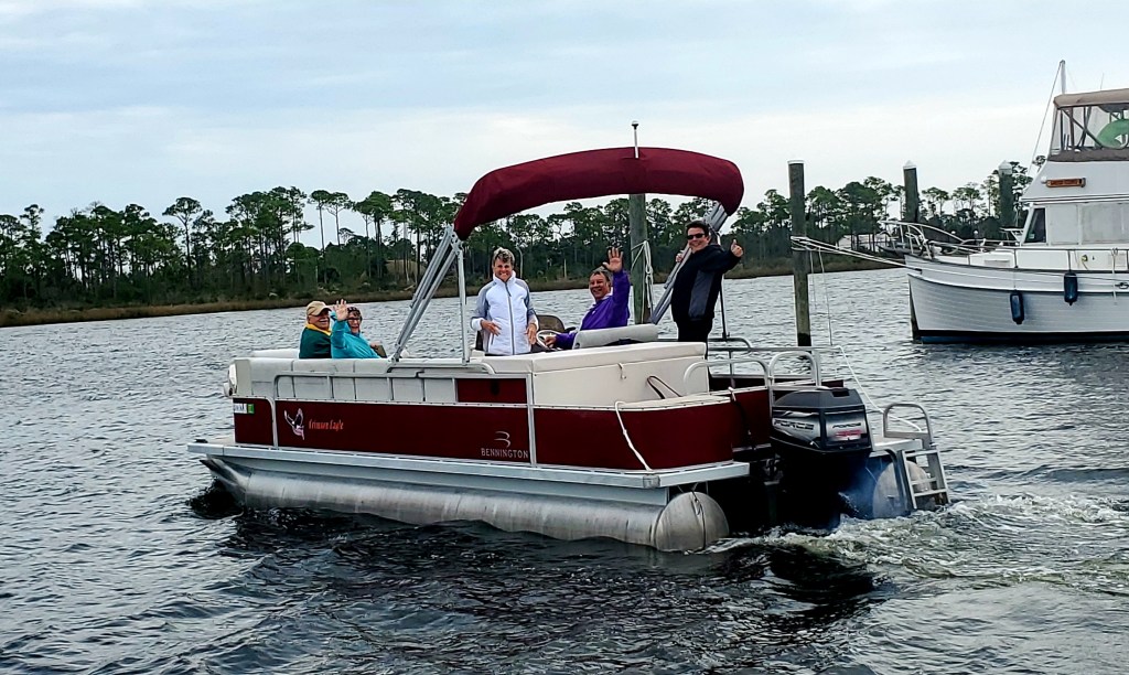 The view of the Gulf from the Pensacola Lighthouse. We watched the Blue Angels practice a few days ago while at anchor on the right side of this photo. The view from the other side of the lighthouse. This is home base for the Blue Angels, and you can see their jets in the center of the picture. Barrancas National Cemetery is on NAS Pensacola, reminding us that national cemeteries exist all over the U.S. — 155 of them. (I’ve applied for burial in Arlington National Cemetery but will most likely end up in one like this.)These brave souls bundled up to take their pontoon out into the Gulf for the Blue Angels airshow. The water looks quite calm here, but it changed. We heard the waves were 5′. They probably turned around.