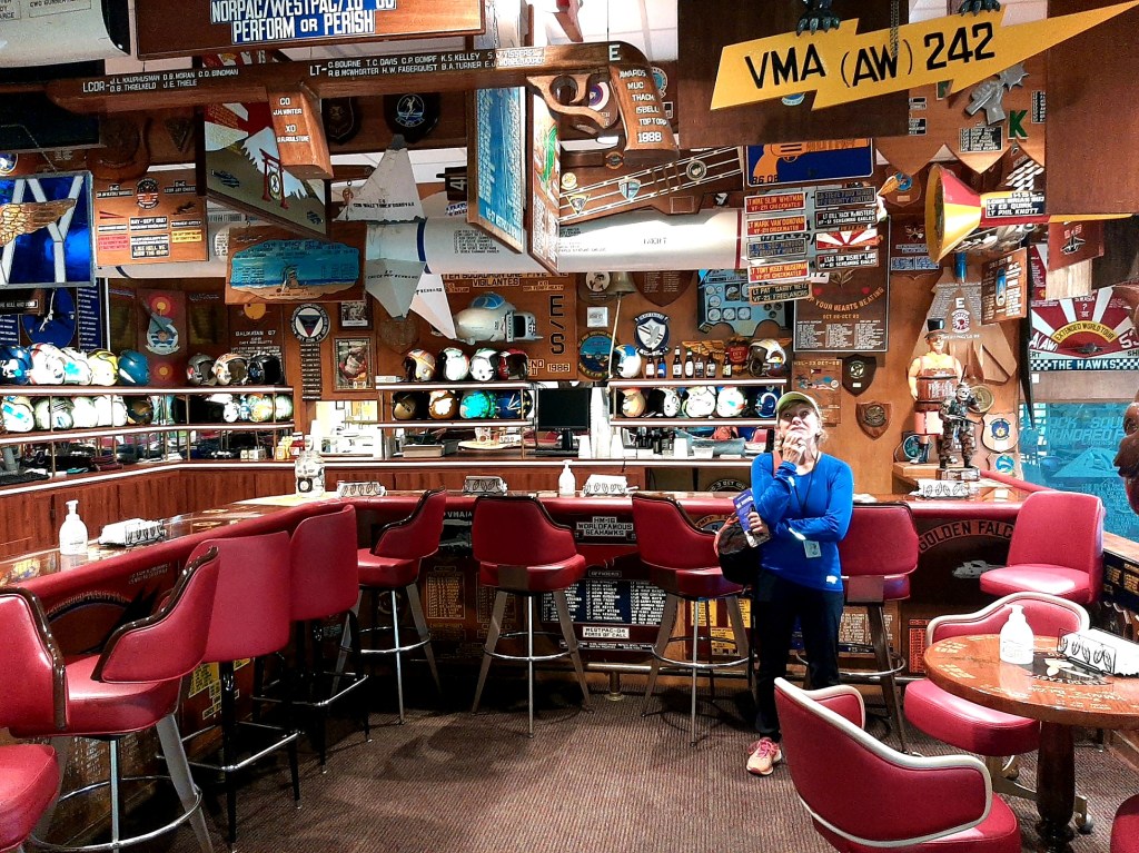 During the VR “trip,” the seats jerk and move to add realism to the experience.A highlight of the museum, to me, was the working cafe which was once the officer’s club at NAS Cubi Point in the Philippines. It was reconstituted here, piece by piece, including hundreds of squadron plaques and signs. I knew many of the squadrons represented here. (I’ve done duty in the Philippines but never saw this club. The base, and club, was covered by ash from Mt. Pinatubo and then returned to the local government.)