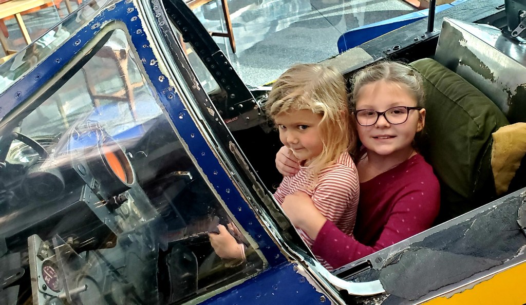 This sculpture at the museum entrance reminded me a bit of Looper docktails after a challenging day, when everyone shares their “war stories” about difficult locks or lost anchors or strong current or fog….A surprise connection to home! This WWII Navy aircraft was salvaged from Lake Michigan, where 17,000 military pilots learned to land on aircraft carriers. A former pleasure cruiser was reconstituted as a training carrier and named USS Wolverine.Future pilots sitting in the cockpit of a Blue Angels plane in the museum. The first female Blue Angel was assigned to the team this year. The Navy has nearly 800 female pilots, but a small percentage of them fly jets.This Navy plane landed at the South Pole in 1956. I landed at the South Pole 40 years later — in a much newer plane. 😉