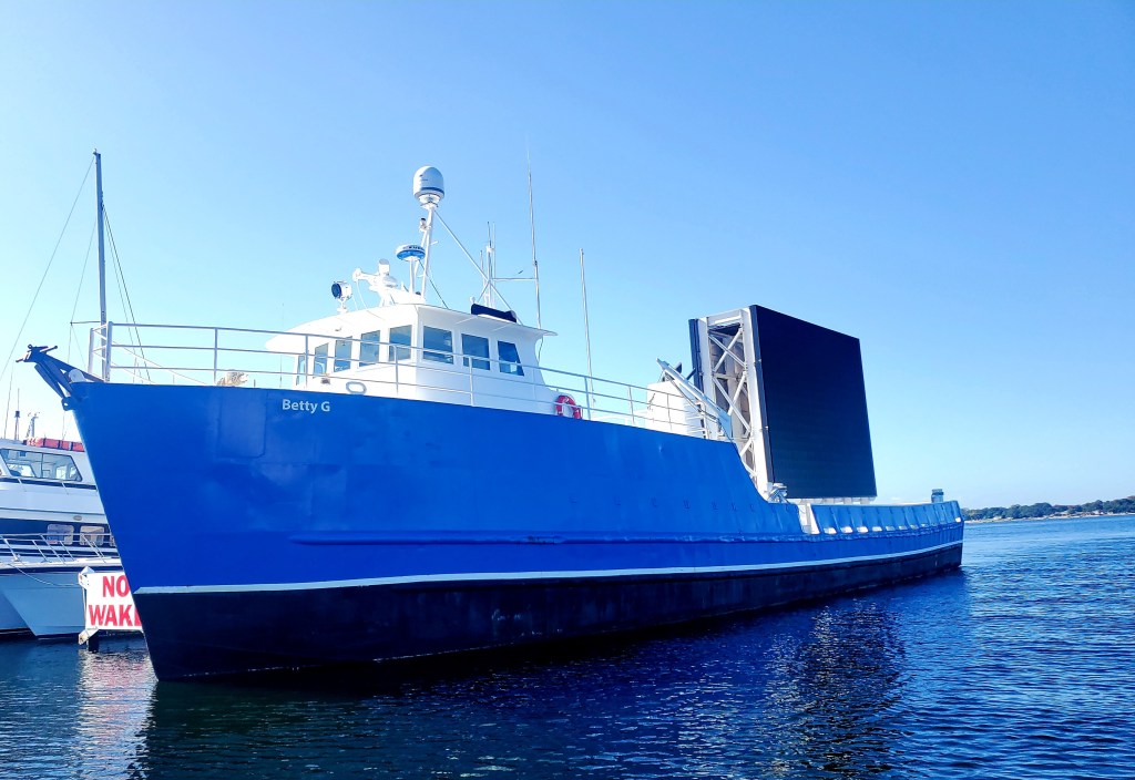 The Betty G has a huge screen on its stern, which carries advertisements along the canal – and sometimes shows movies. Or a church service. (So we heard.)