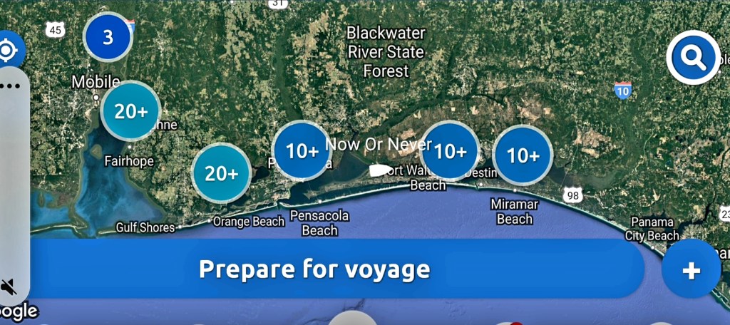 Here they come! Each circle represents the number of Looper boats in that area – from Mobile, Ala. toward Panama City, Fla. We’re included in the “10-plus” circle on the right. We hear there are far more boats this year than in previous years.
