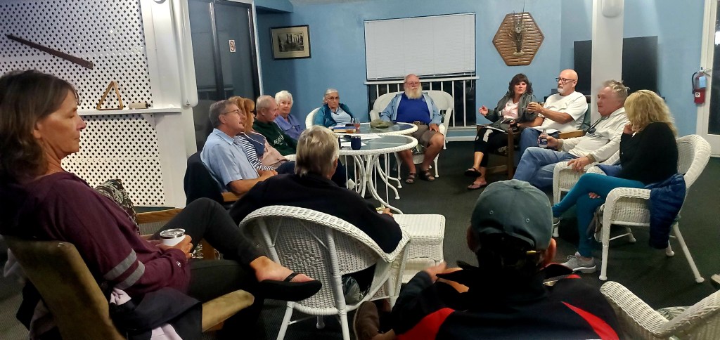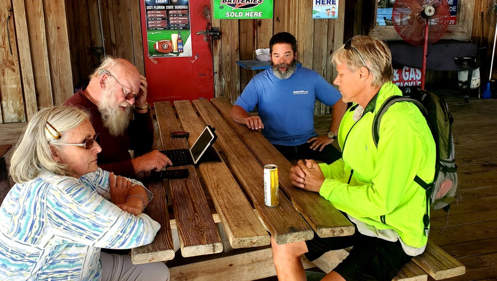 A planning meeting among Loopers in Carrabelle to discuss the gulf crossing. The group divided itself between those who go faster than 10 mph and plan the longer crossing, and those who run slower and choose the shorter one.