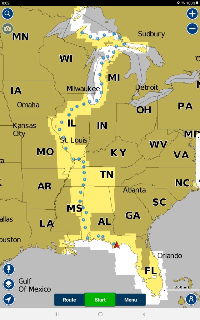 Many Moons has seen nine states so far. Here’s our route from Lake Superior to Carrabelle. Each dot represents a stop, although several stops aren’t visible here.