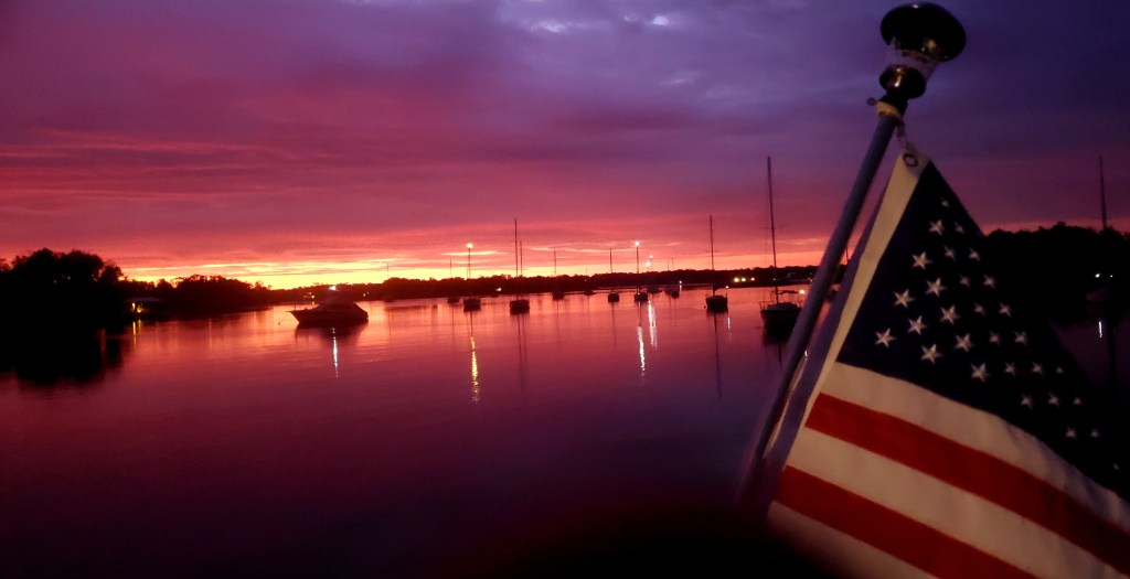 Which is just as well. Tonight, Many Moons is anchored about four miles offshore in the vicinity of Tarpon Springs. It would have been hard to get to the boat! (I tried to find a marina slip there but none was available, which isn’t surprising with so many Looping boats in Florida right now. At least 15 boats left Carrabelle this morning to cross the gulf, all headed in this direction. I wonder if that’s a record.)