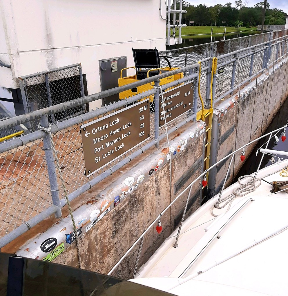 But, wait, there’s more! News, that is. Jeff finally did it. He suggested he would, and he did. Took Many Moons out alone, I mean. Through a lock, no less. He’s taken her out alone in Michigan, so knew that he could. We’ve met others who are doing the entire Loop by themselves, so it’s not that crazy — but they probably have a 2nd engine or thruster (making it easier to steer in close quarters) and a more convenient physical set-up of the boat (making it easier to put one’s hand on the lock or pier). And they probably don’t have Type-1 diabetes (making stress of any sort an extra risk).