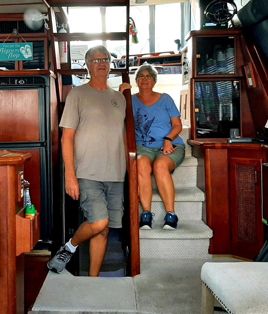 So. Here’s the story. While Many Moons remained in port these recent weeks at the J.P. Franklin Lock, a familiar Looping boat arrived at Fort Myers, some 15 miles west. We met Sonny and Linda from Beachfront at a quirky marina in Tennessee more than two months ago. (See “Into Tennessee.”) Sonny and Jeff immediately began discussing ways to enclose the exposed parts of a boat. Jeff had been considering this for months, and it turned out that Sonny is something of an expert on the subject. They reconnected in southern Florida, arranged the barter, and now Many Moons has a semi-enclosed stern. (The material is called eisenglass, which translates to “iron glass” in German. Think of it as a kind of vinyl alternative.)